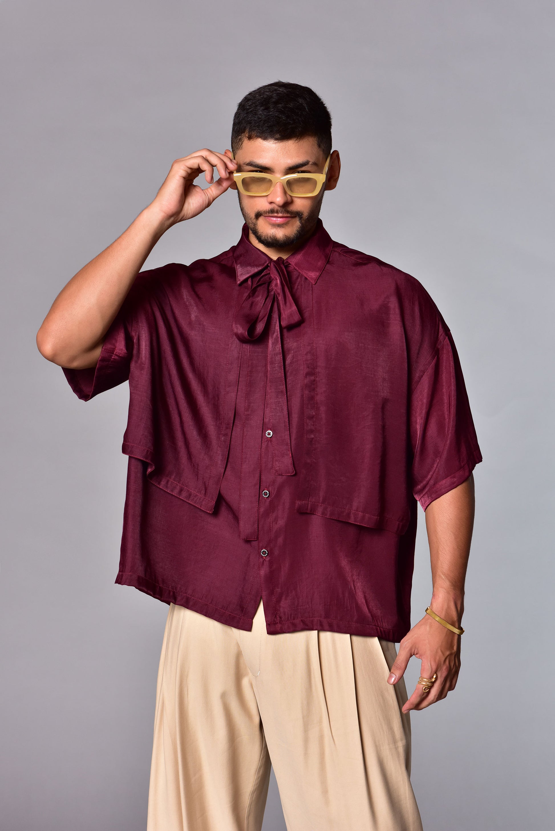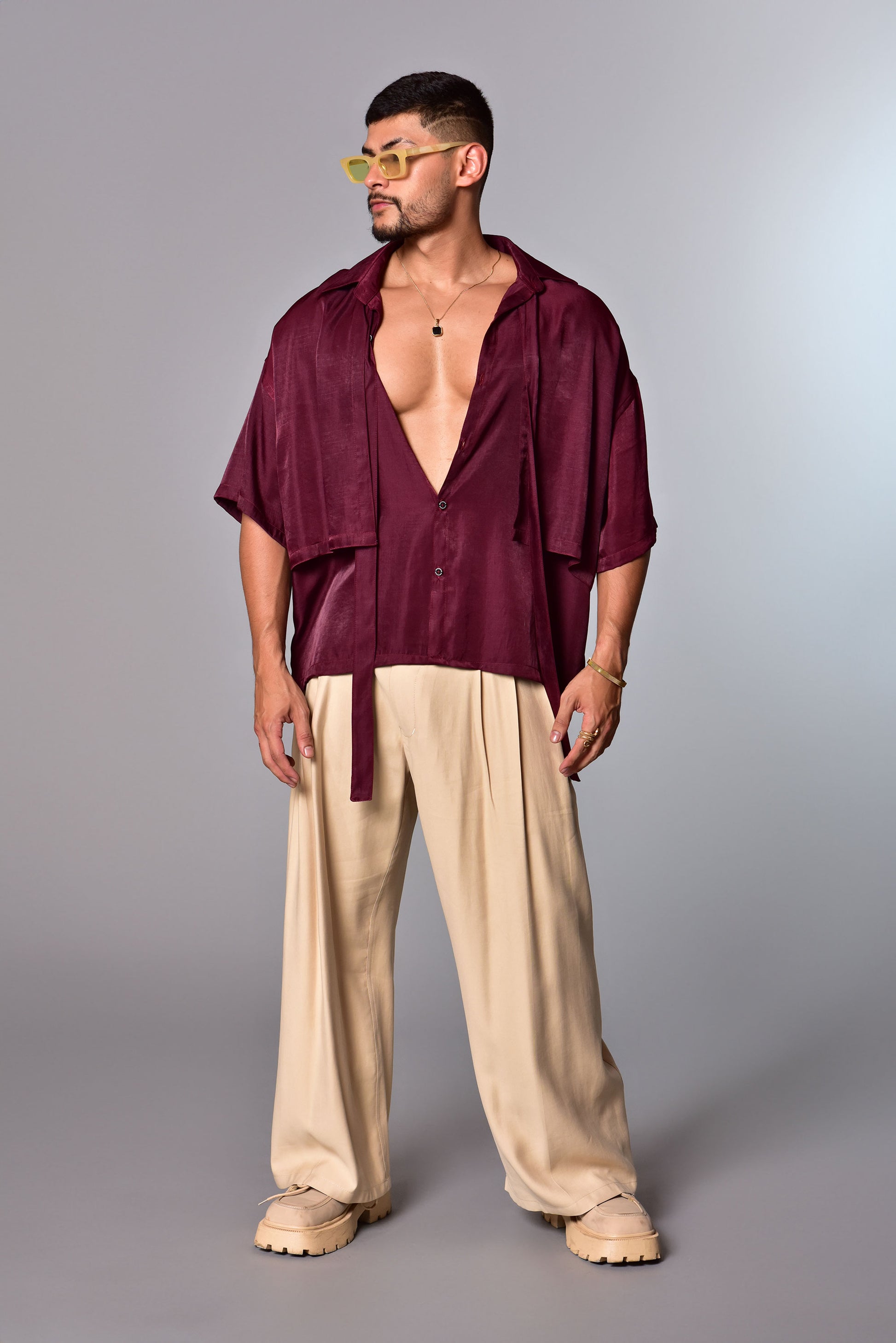 Camisa oversize tipo crop en satín ligero, con cuello clásico, corbata y cortes frontales que aportan un toque contemporáneo. Fluida, elegante y minimalista — diseñada para destacar con naturalidad.