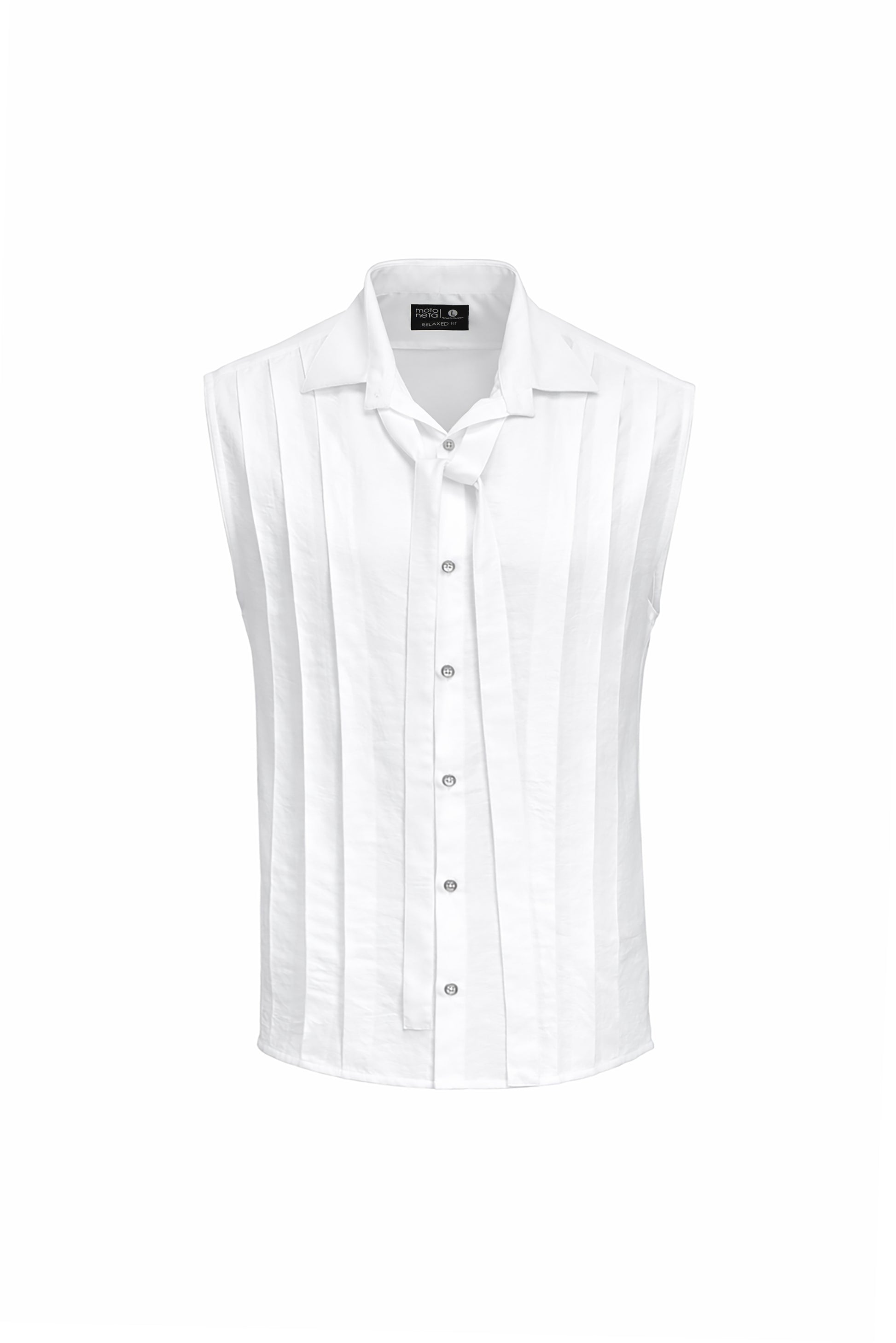 Camisa sin mangas en rayón viscosa fluida, con corbata delgada, cuello en punta y botones ocultos. Minimalista, liviana y con mucho carácter.