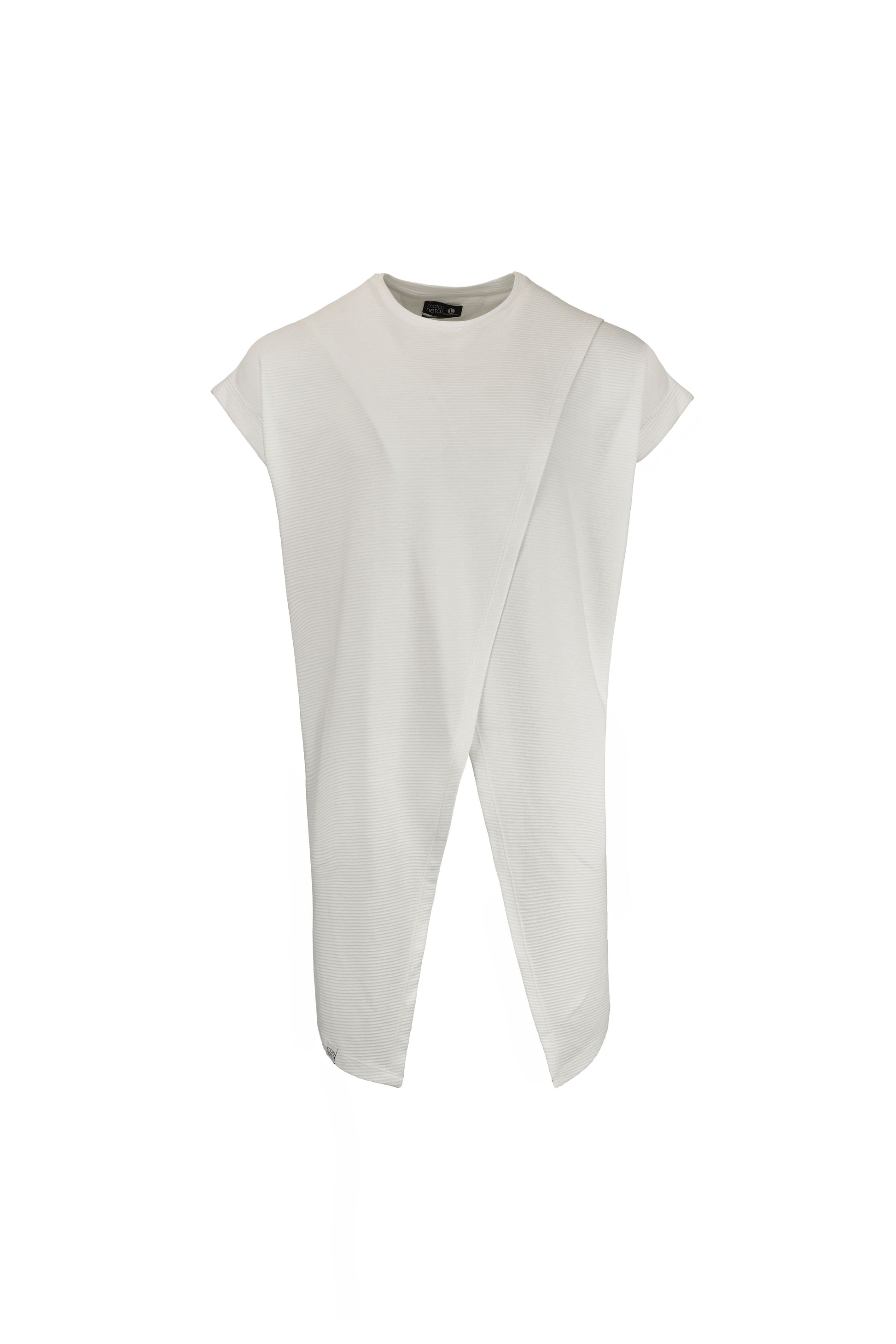 Camiseta asimétrica de largo extendido con capa diagonal superpuesta que aporta profundidad, fluidez y una silueta arquitectónica con caída limpia con volumen controlado, mientras la horma relaxed fit con hombro caído garantiza comodidad sin perder presencia. La apertura frontal estiliza visualmente la figura y potencia el layering.