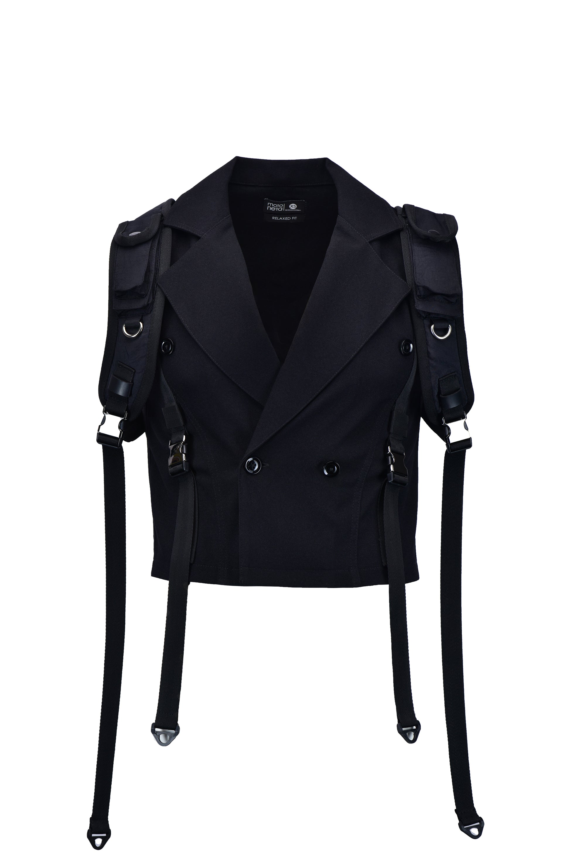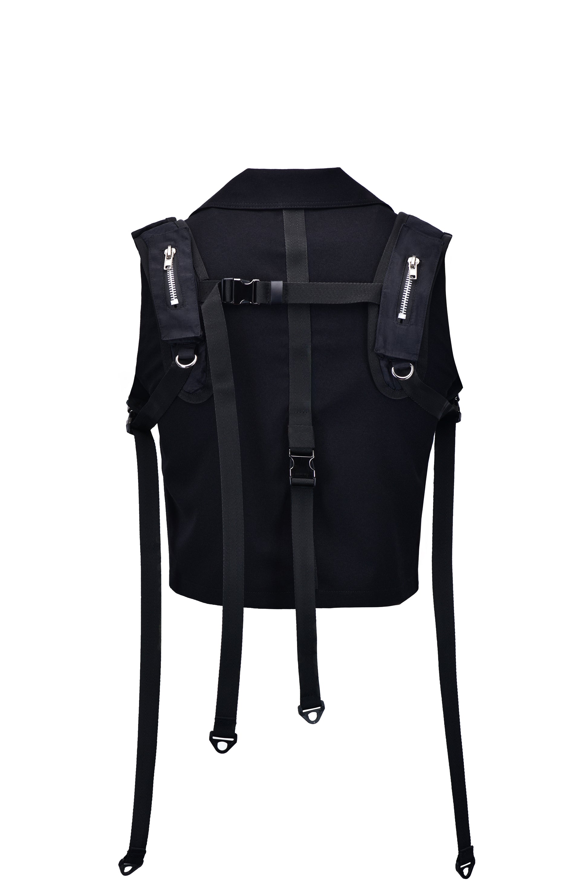 Este chaleco fusiona la elegancia de un corte sastre clásico con detalles techwear de carácter vanguardista. Las hombreras con correas en contraste y los acabados estructurados logran un equilibrio perfecto entre sofisticación y modernidad. Una pieza creada para mentes contemporáneas que buscan destacar en eventos, viajes o escenarios urbanos con una declaración de estilo auténtico y único.