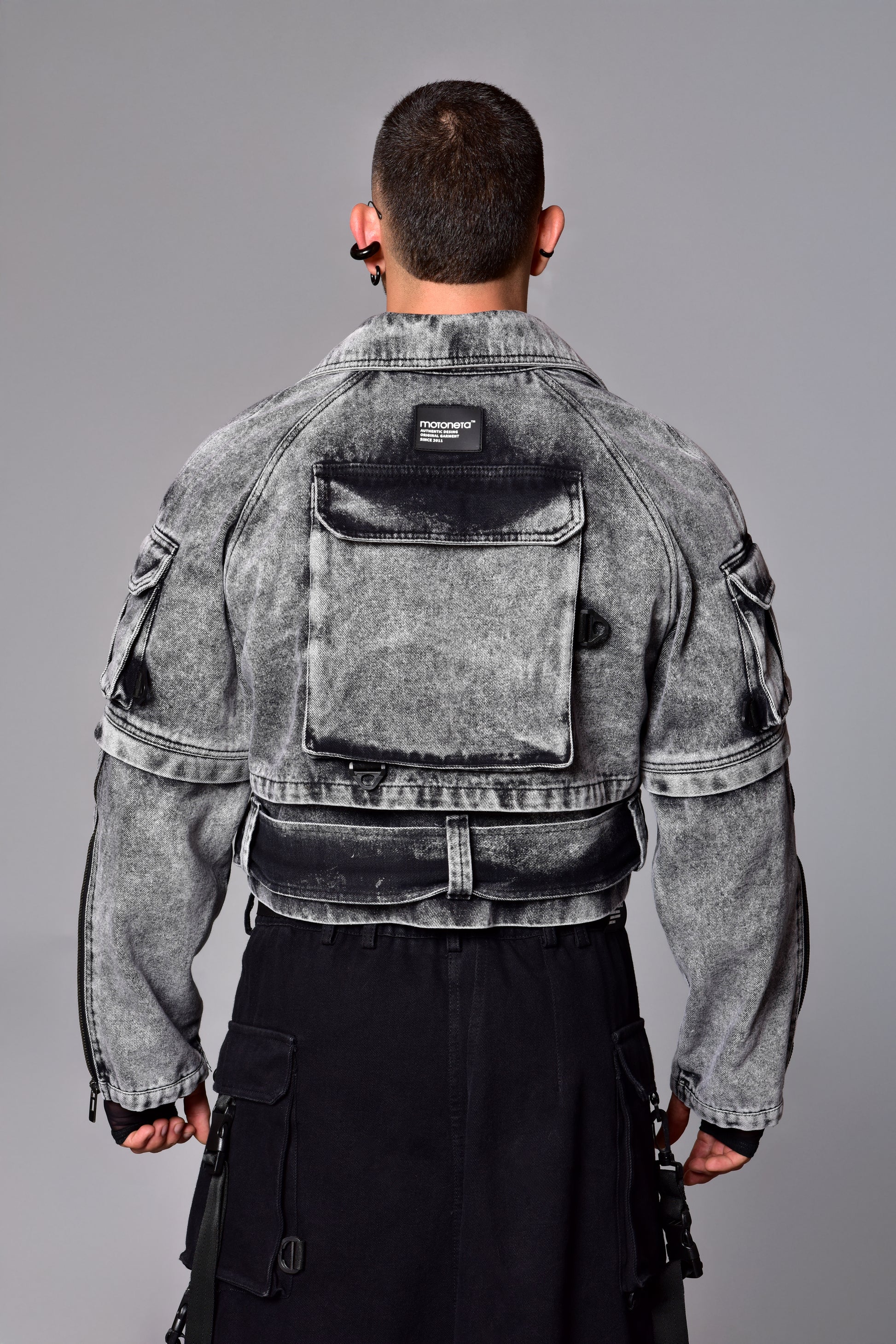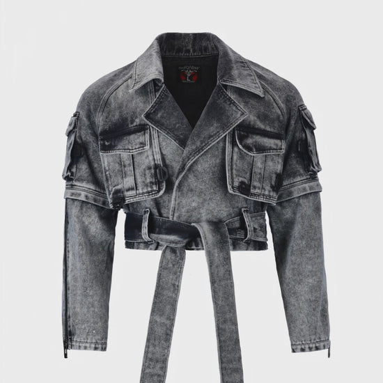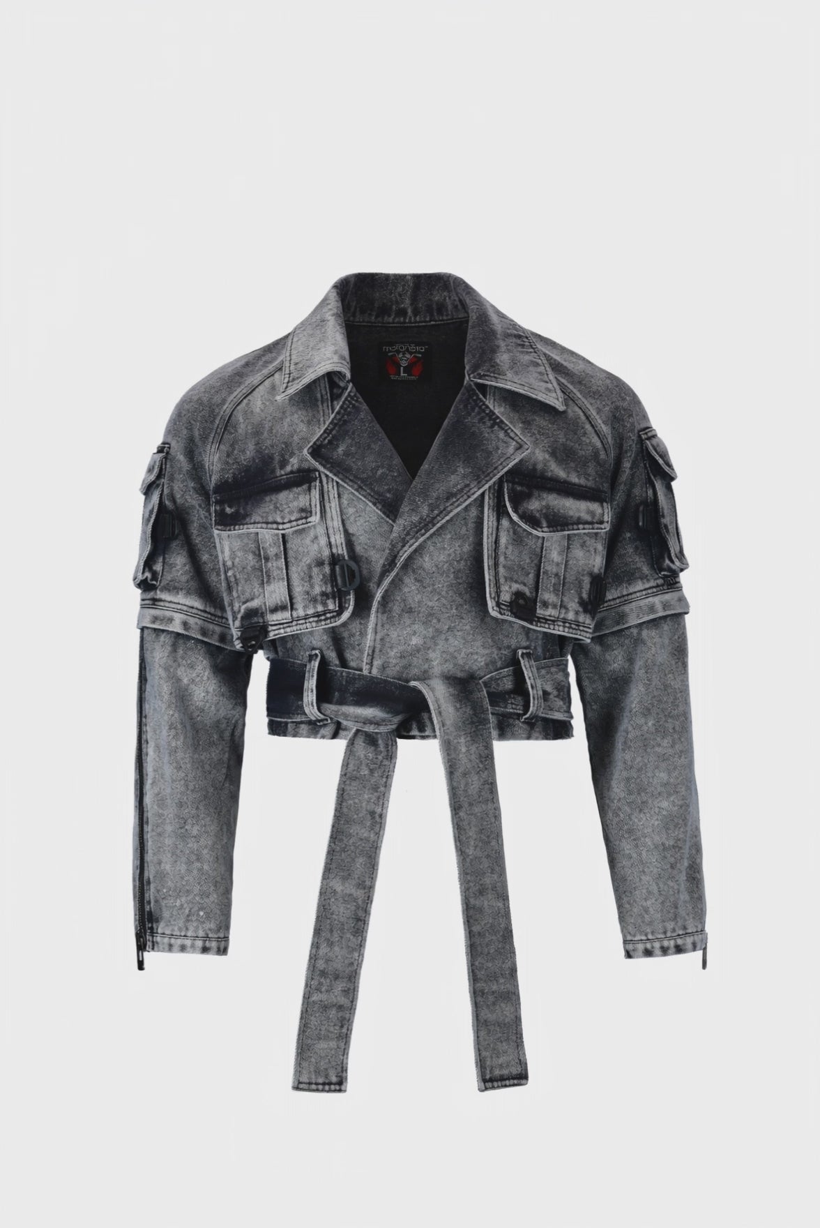 Inspirada en el techwear y en futuros apocalípticos, esta chaqueta combina un lavado sky bliss con diseño cropped, correa ajustable y bolsillos cargo funcionales. Una prenda de carácter utilitario y estético que transmite rebeldía, resistencia y estilo urbano futurista.