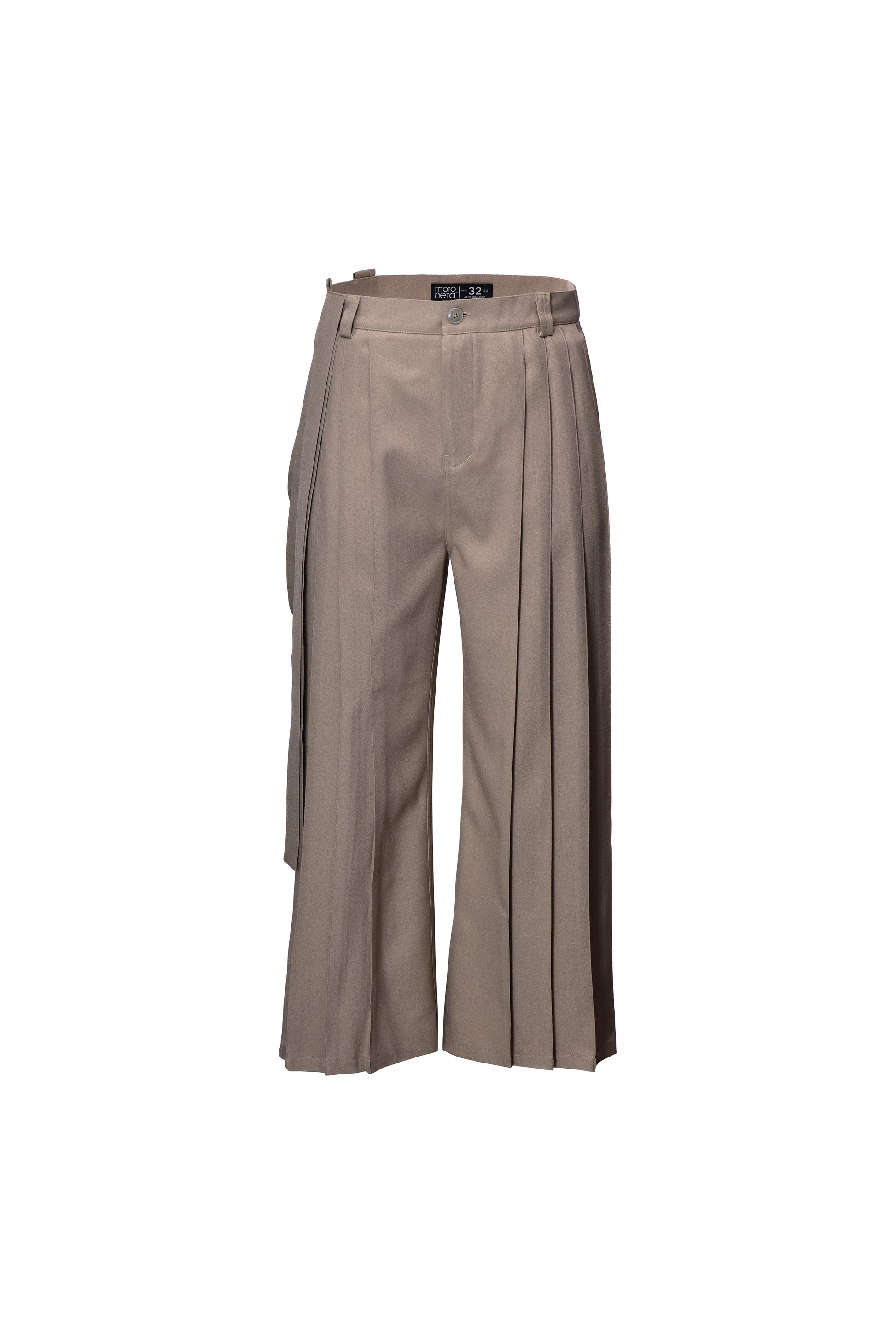 Con un corte ultra wide leg y prenses frontales extra grandes, este diseño ofrece una silueta imponente y fluida. Las correas laterales tipo tirantes aportan un detalle distintivo, mientras los bolsillos funcionales y el cierre frontal con cremallera y botón completan una prenda de fuerte personalidad.